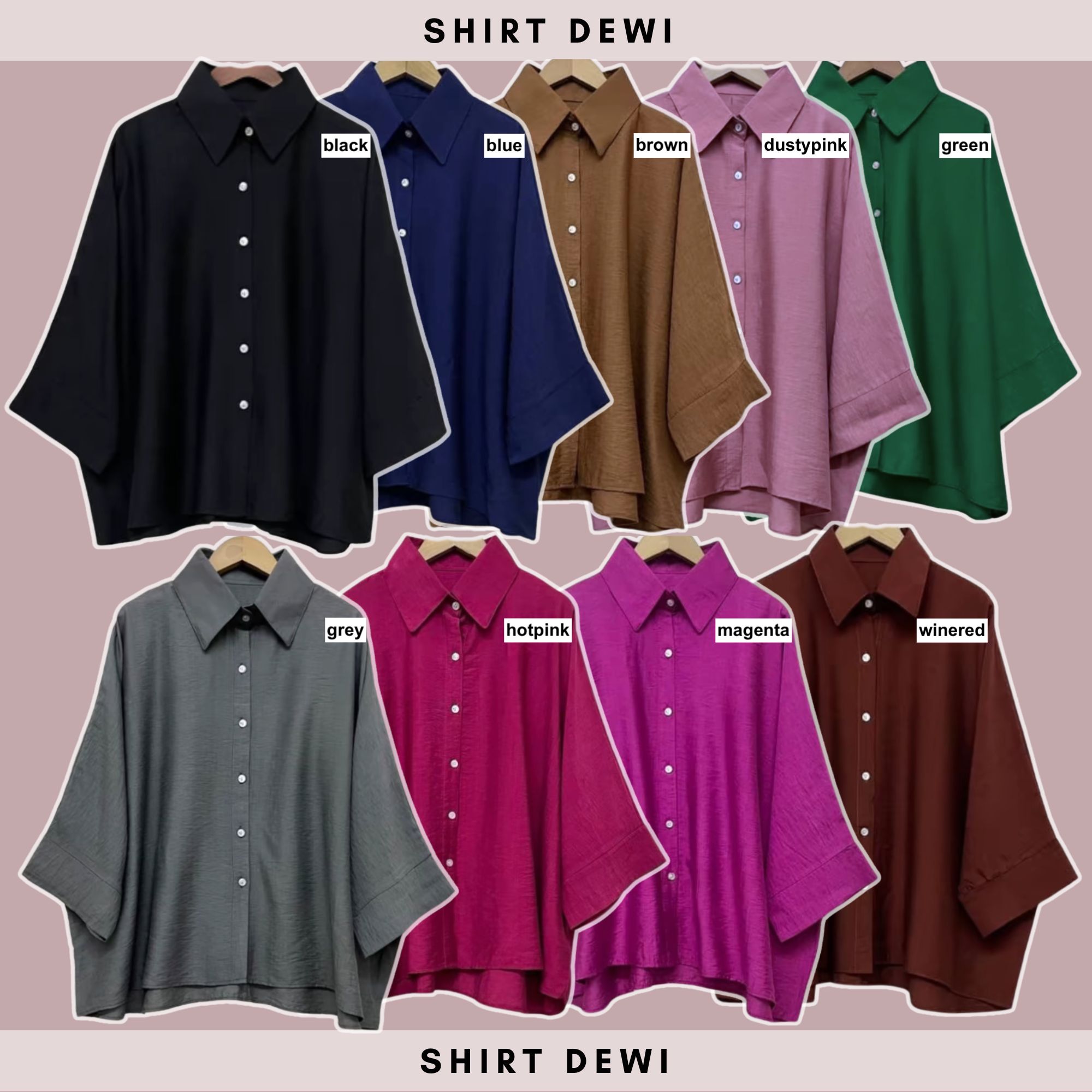 Wine Red, Black, Brown, Dusty Pink, Green, Grey, Blue, Hot Pink, Magenta